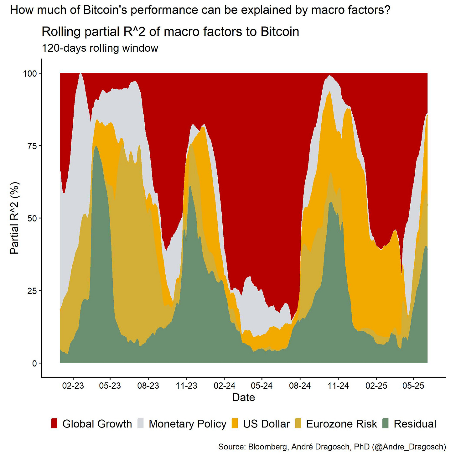 In this context, it is also worth highlighting that global growth expectations have been the most dominant macro factor for bitcoin, explaining around 45% of bitcoin’s historical performance variation from December 2011 until February 2025. The second most important macro factor for bitcoin appears to be changes in monetary policy expectations which explains another 22% of bitcoin’s performance variation. The following chart shows how much of bitcoin’s performance can be explained by macro factors: